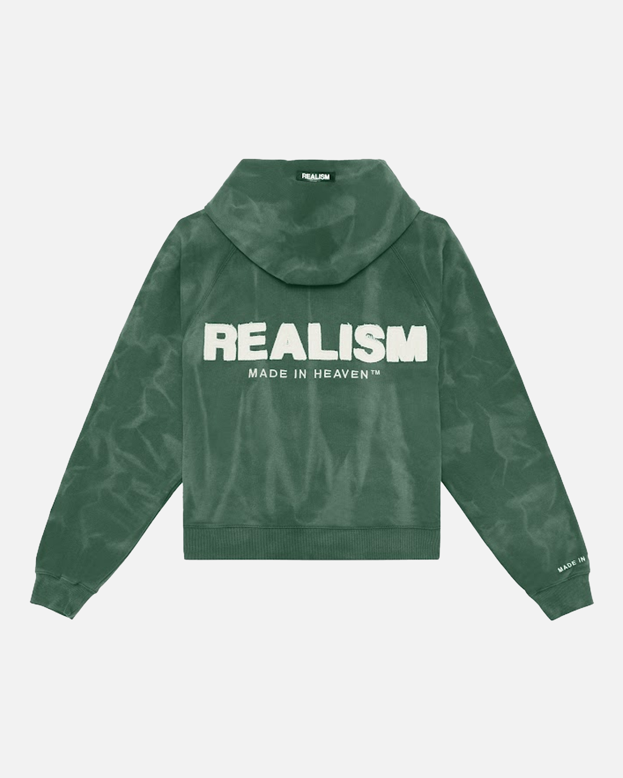The Legacy Series represents the next evolution of Realism's design identity. Made with an acid washed French Terry in a Washed Moss guise. This hoodie features distressed patch work including the “R” on chest and “REALISM” on back. Custom metal accents and a silicon applique logo on the hood help bring together the design.