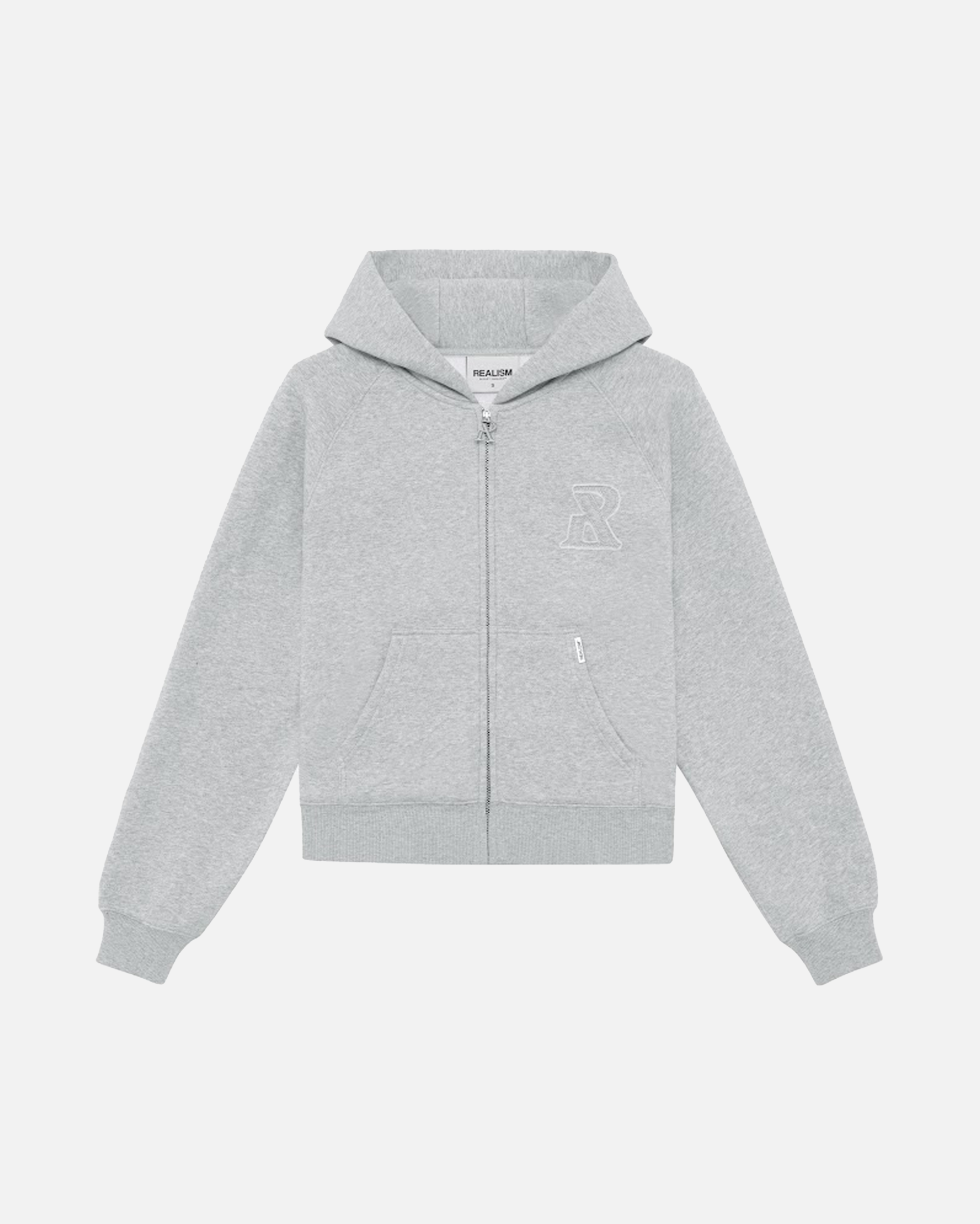 The Legacy Series represents the next evolution of Realism's design identity. Made with Realism's signature comfy fleece in a Grey Marle guise. This zip hoodie features distressed patch work including the “R” on chest and “REALISM” on back. Custom metal accents and silicon applique logo on the hood help bring together the design.