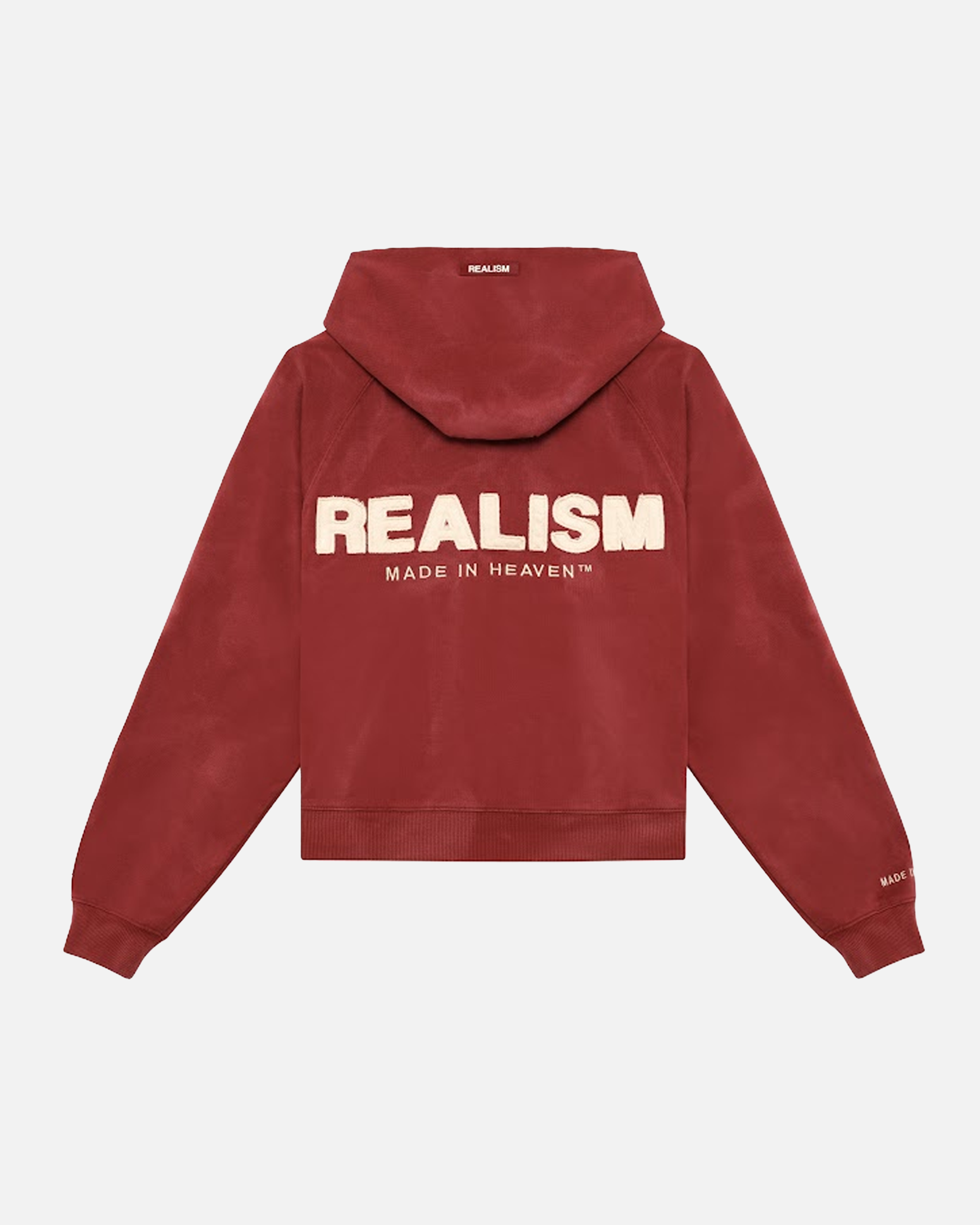 The Legacy Series represents the next evolution of Realism's design identity. Made with an acid washed French Terry in a Carmine guise. This zip hoodie features distressed patch work including the “R” on chest and “REALISM” on back. Custom metal accents and a silicon applique logo on the hood help bring together the design.