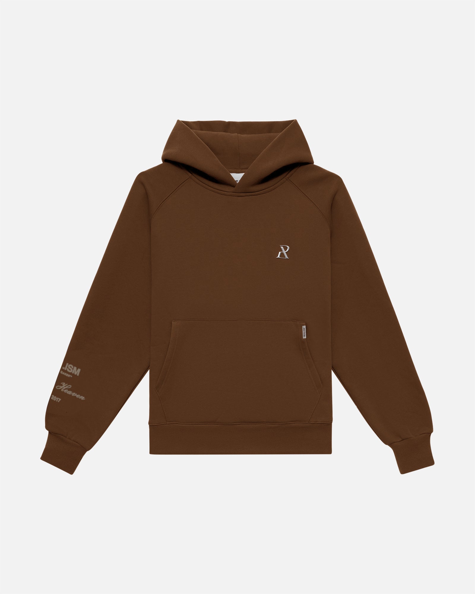 The classic hoodie is refreshed Realism's deluxe touch. Made with Realism's signature comfy fleece in a oversized Mocha guise, this hoodie features metal accents including custom "R" branded zips, chest emblem and tag. An embroidered "R" on the hood, silicon applique logo on the back and sleeve print ties together a design that captures the essence of premium loungewear.