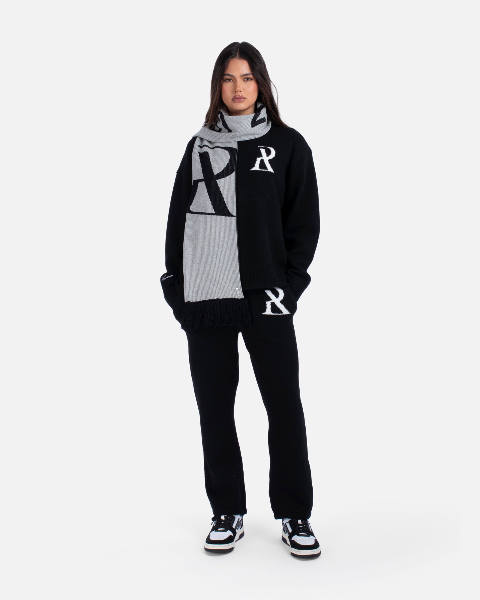 This essential accessory is refreshed with a deluxe signature from the Realism Radiant collection. Made with an alternating jacquard knit in a black & white guise, this scarf features a metal "Realism" plaque, woven label & black tassels. Knitted "REALISM", "EST 2017" & "R" emblem motifs elevate a design that captures the essence of premium loungewear.