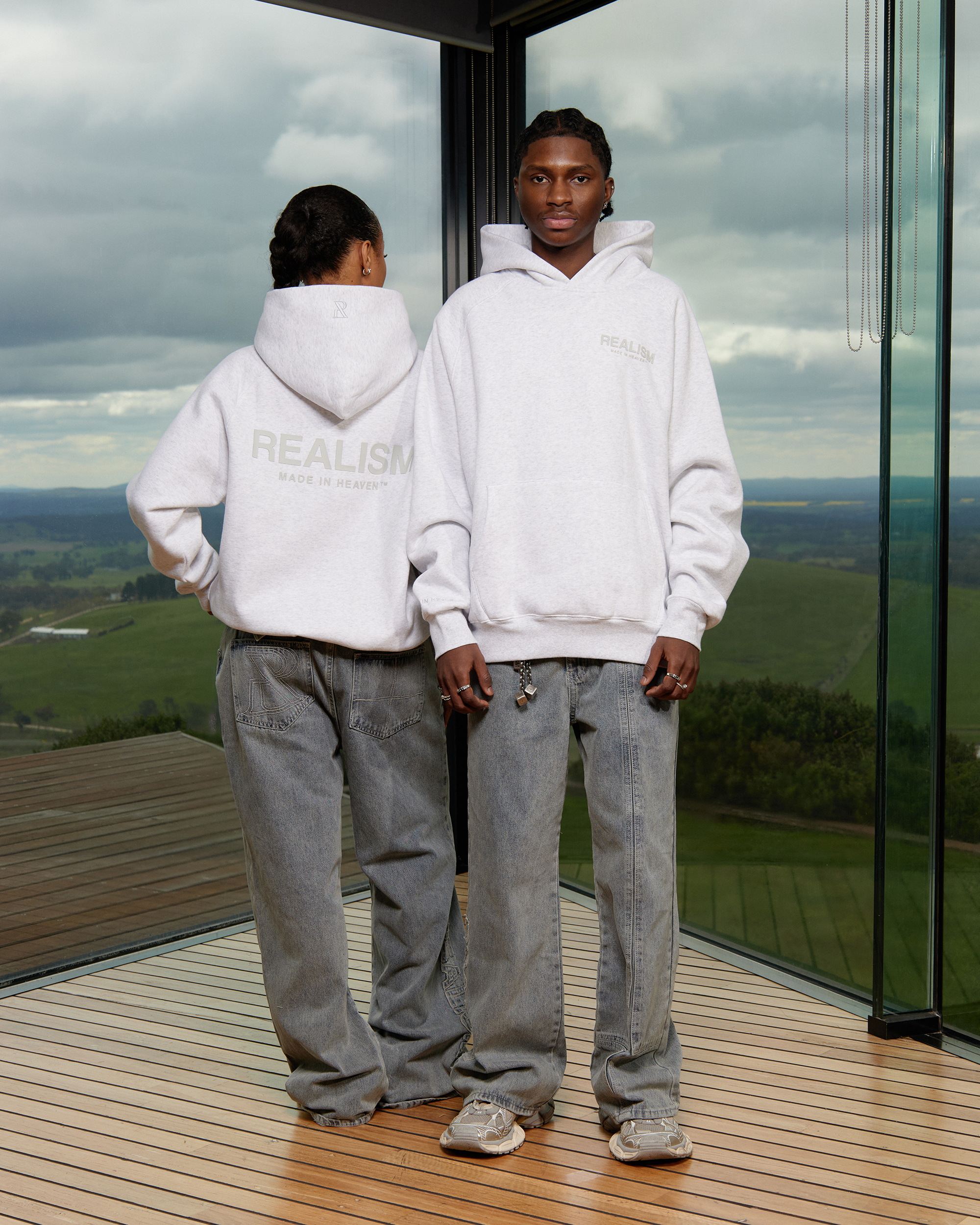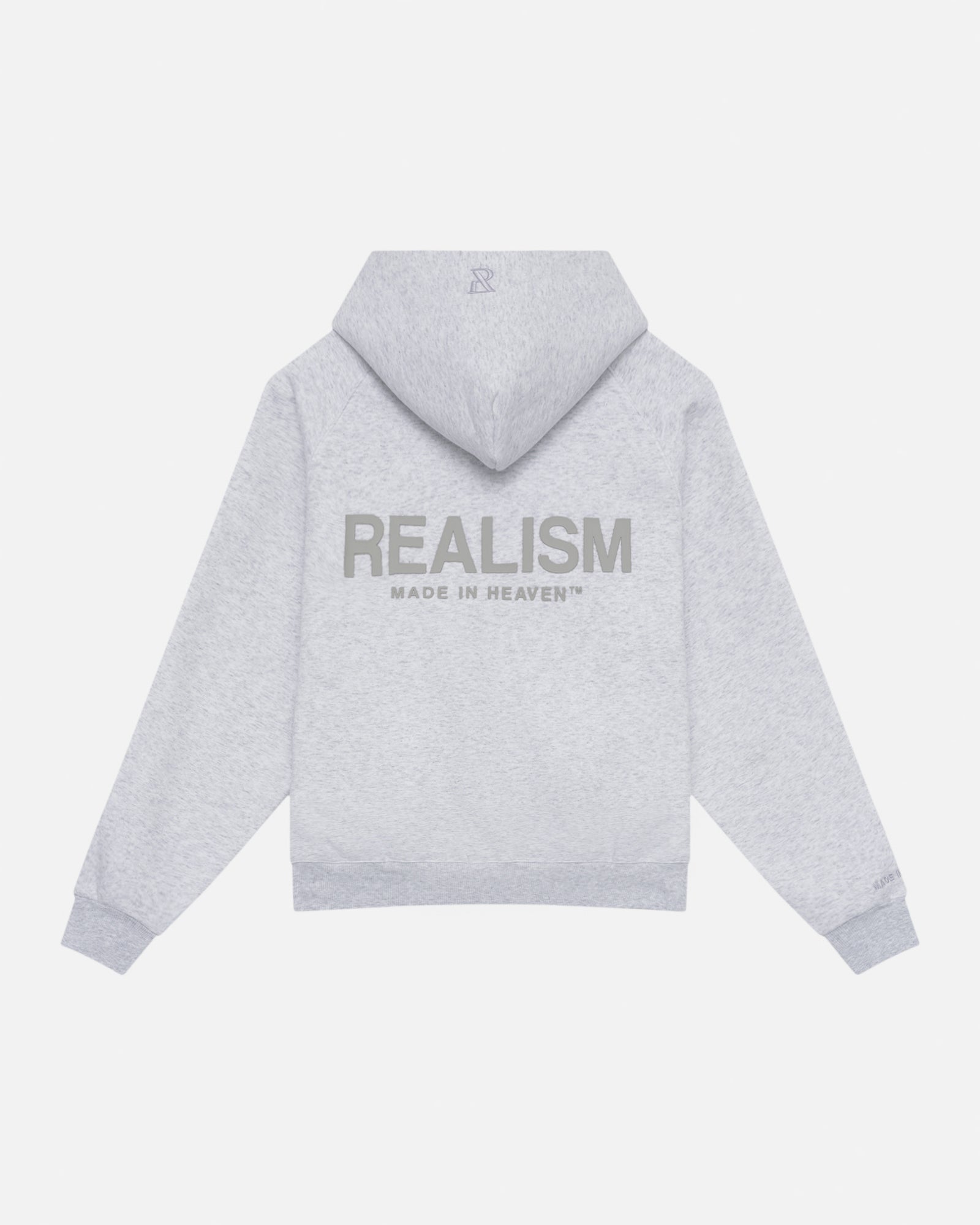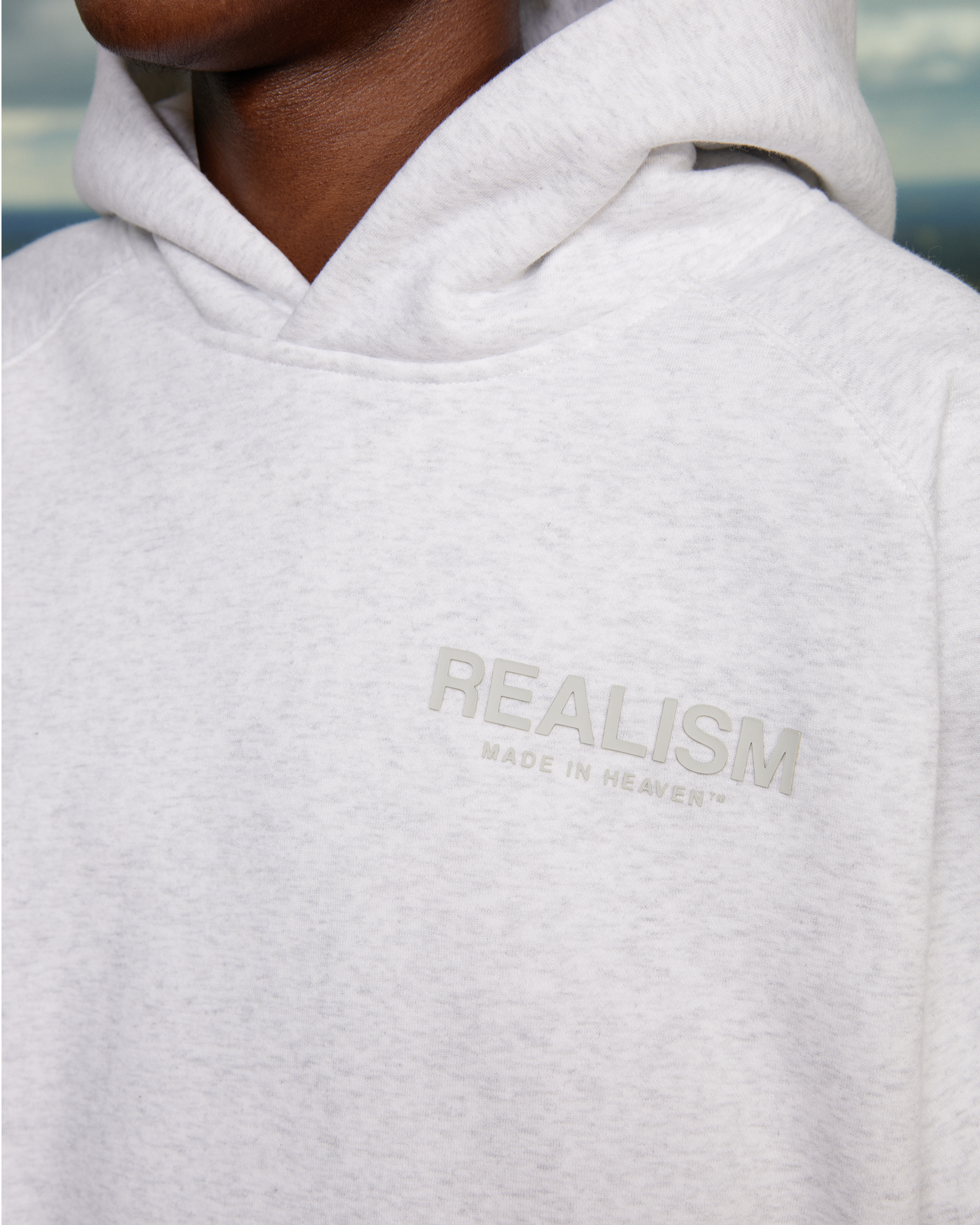 The ultimate hoodie. Premium, comfortable, and designed with purpose. Featuring Realism's signature 350 gsm fleece crafted into a raglan, oversized silhouette, this hoodie is accentuated with 3-dimensional silicone applique logos on the front and back. An embroidered "R" logo on the hood and a "Made in Heaven" motif on the right sleeve complete this iconic design.