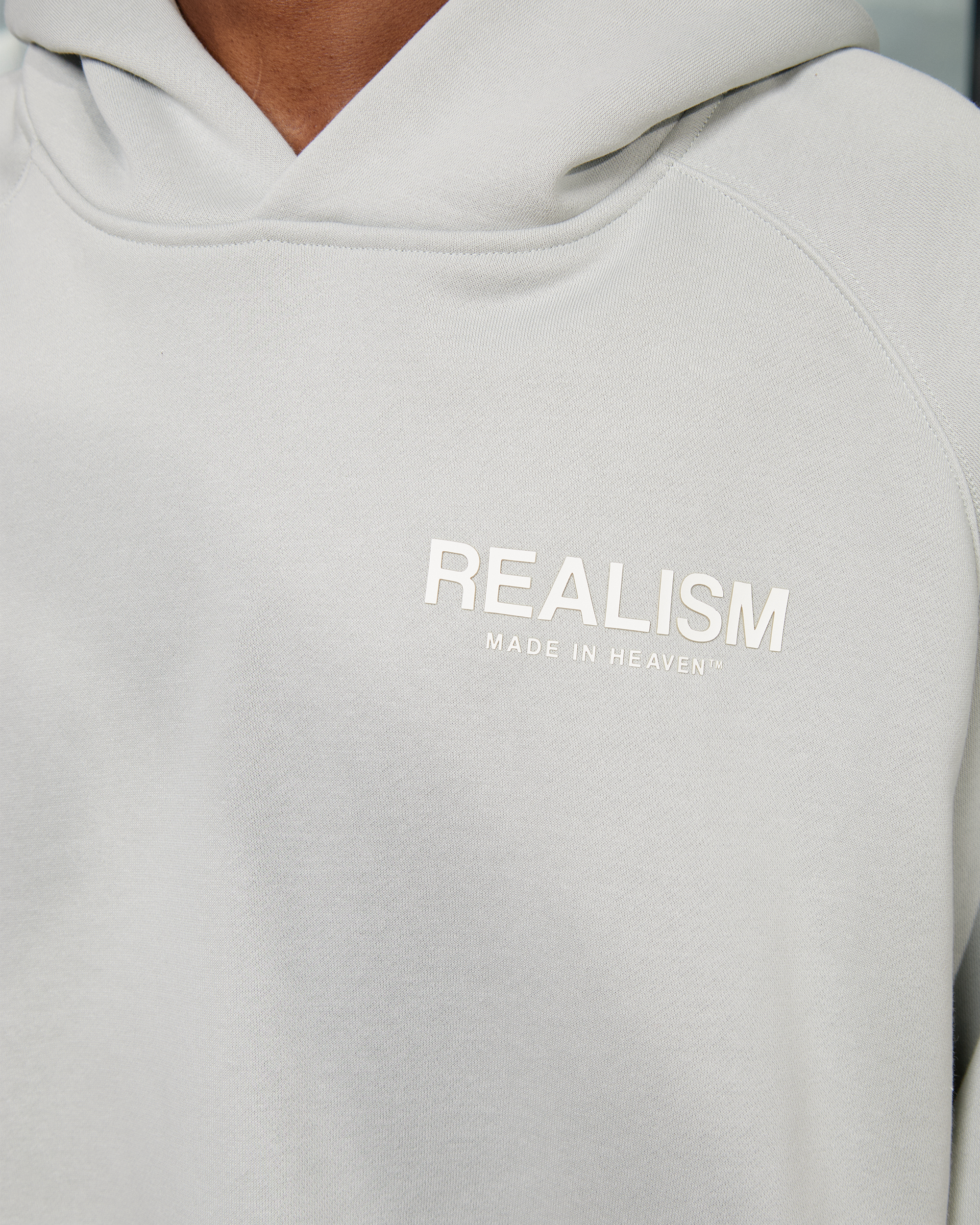 The ultimate hoodie. Premium, comfortable, and designed with purpose. Featuring Realism's signature 350gsm fleece crafted into a raglan, oversized silhouette, this hoodie is accentuated with 3-dimensional silicone applique logos on the front and back. An embroidered "R" logo on the hood and a "Made in Heaven" motif on the right sleeve complete this iconic design.