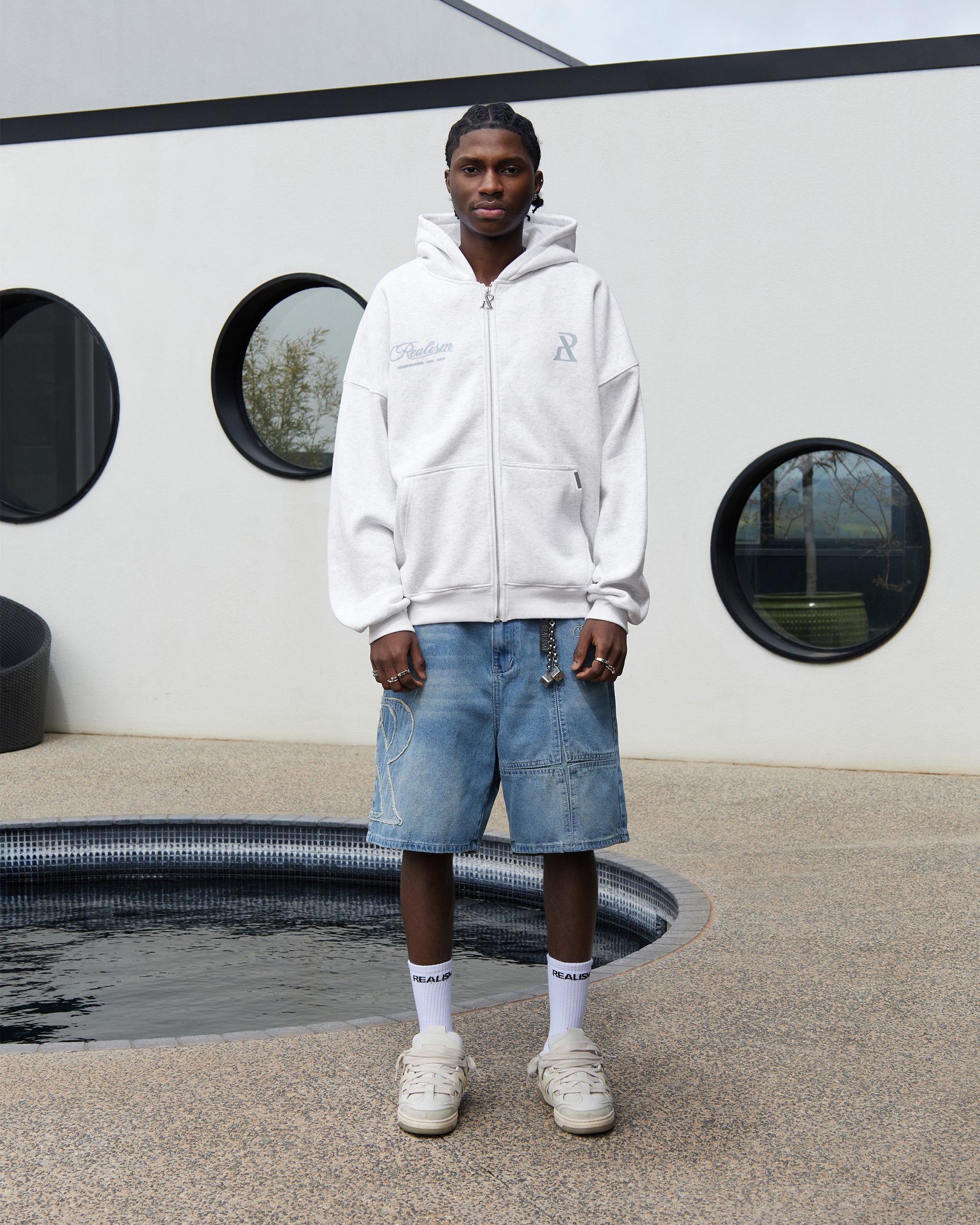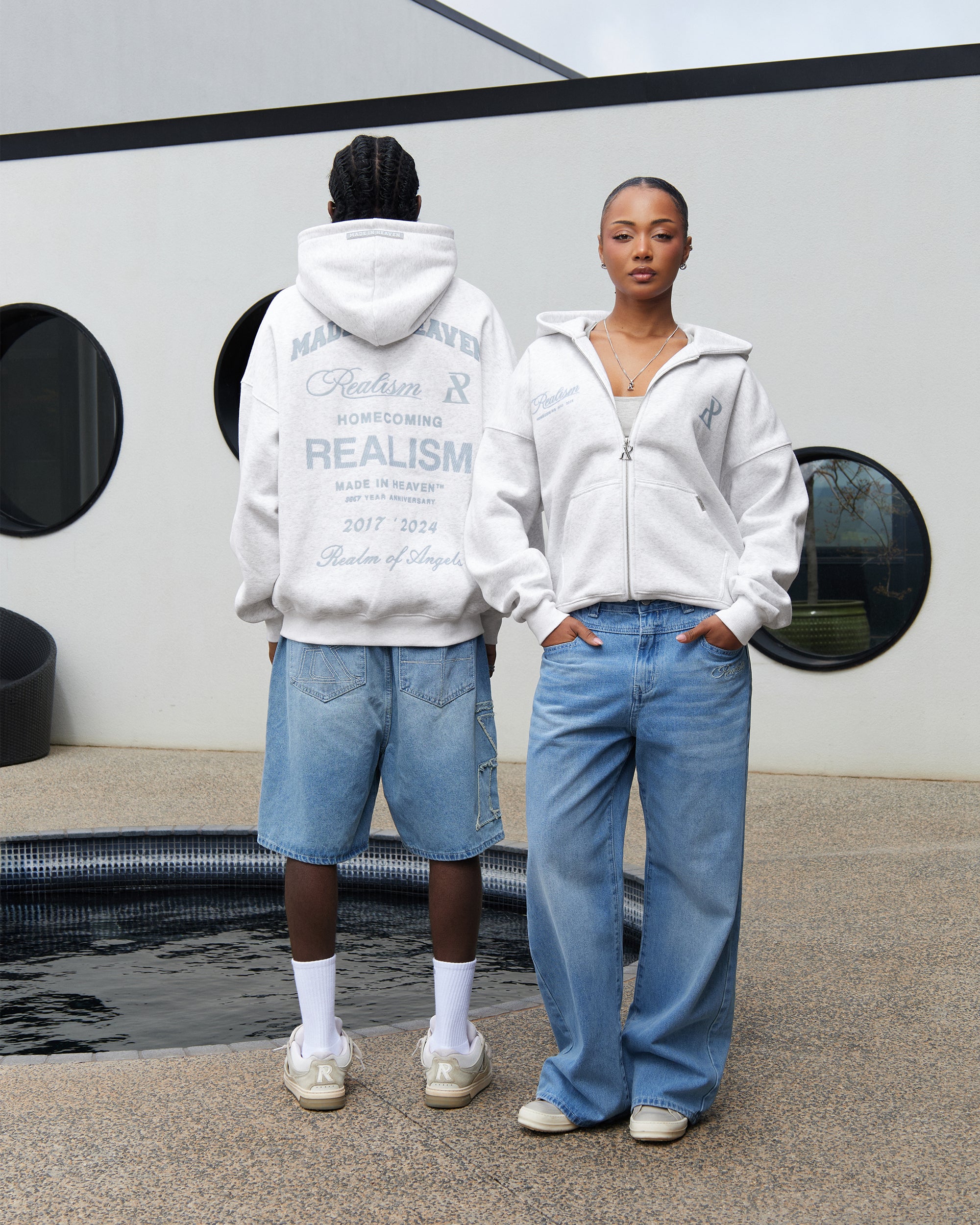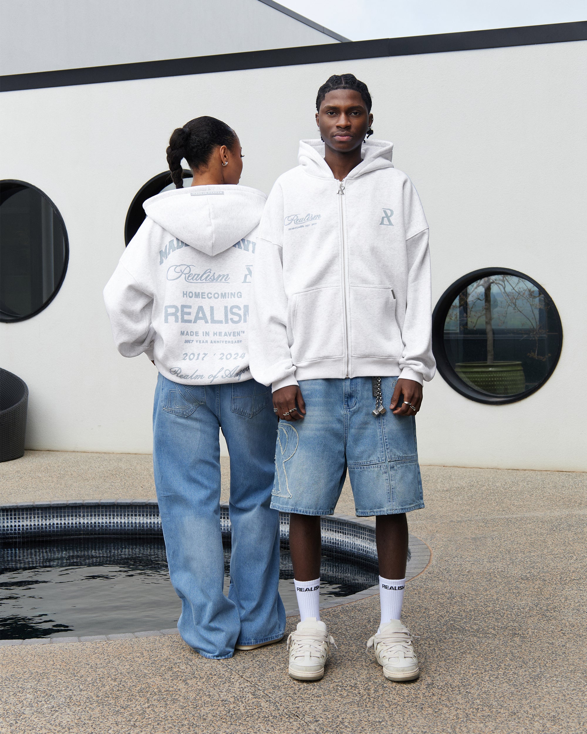 Refreshed with a deluxe signature from the Homecoming Collection. Crafted from Realism’s signature 350gsm fleece in a timeless Snow Marle guise, this oversized hoodie features a custom “R” branded zip and detailed anniversary graphics that commemorate the Realism journey from 2017 to 2024.