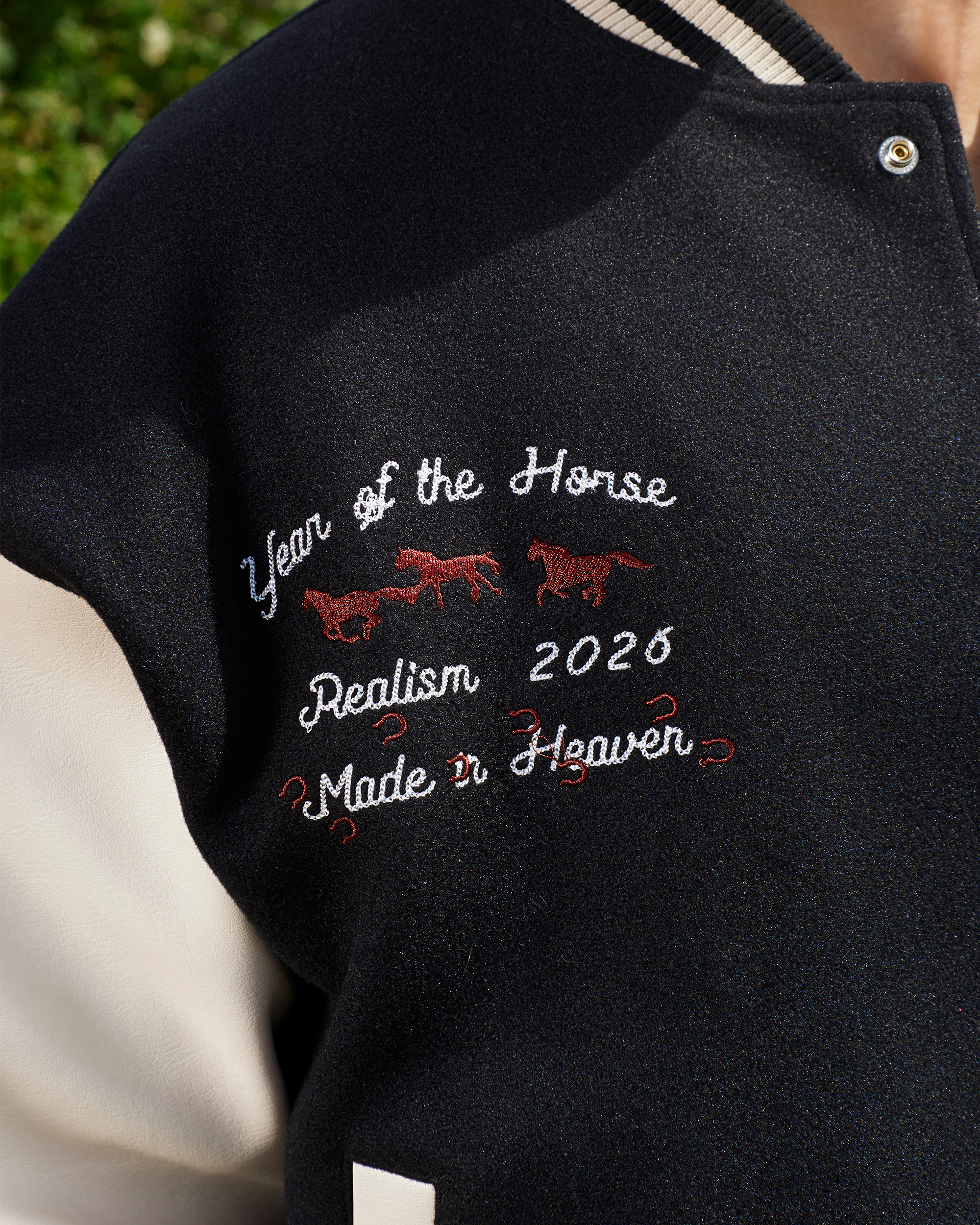 A statement piece from the Year of the Horse collection. Featuring embroidered and chenille appliqués, felt patch work and wool-look fabrication. Finished with a wool-look body, contrast sleeves and a striking all-over printed lining, it’s designed to be just as impactful on the inside as it is on the outside.